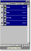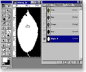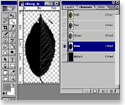 This step is only needed for the leaf textures, since the bark textures don't have an alpha channel. The leaf .png images hold an alpha channel, but this channel is lost when one just saves as .tiff (perhaps programs other than Photoshop handle this case differently). To create the new alpha channel, select the channels tab and Create a new channel (left picture). A new Alpha Channel appears. Now choose one of the color channels and select the empty area around the leaf using the Magic Wand Tool (upper right), Invert the selection, go back to the alpha channel and fill the selected area white (lower right picture). Perhaps you'll need to do some clean-up work at the borders of the alpha channel. You should now flatten the image, since the transparency is no longer needed and this will save us from some headache later. |